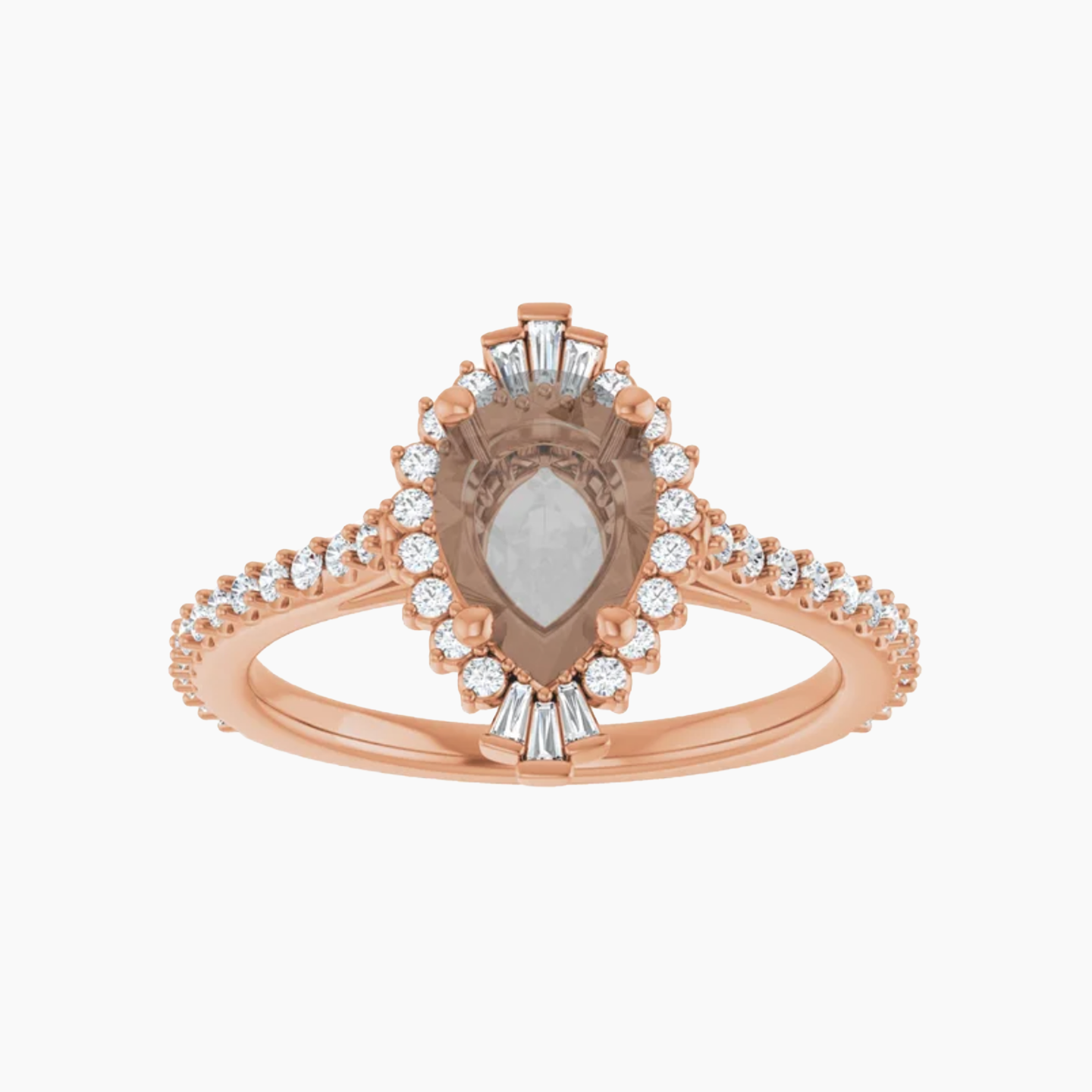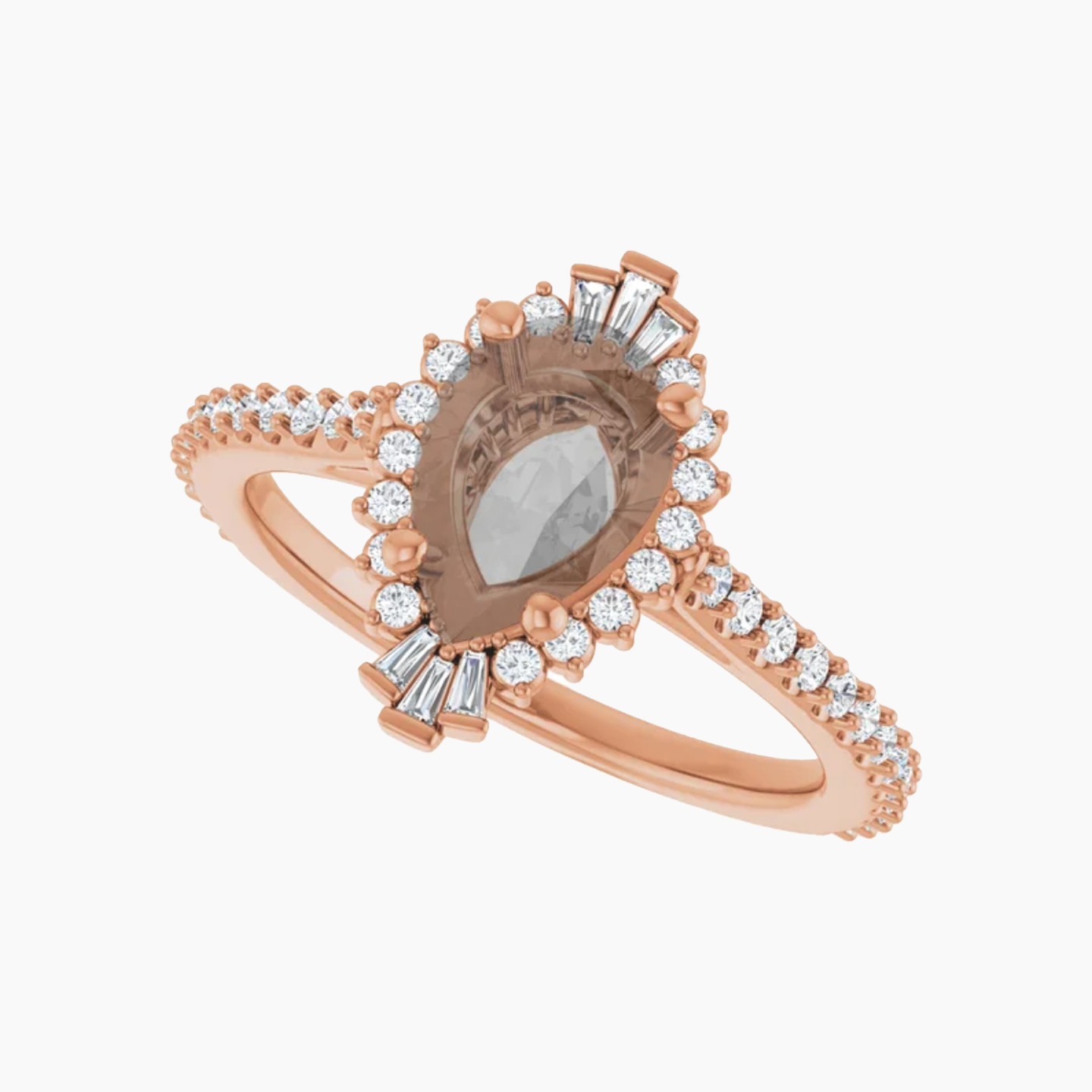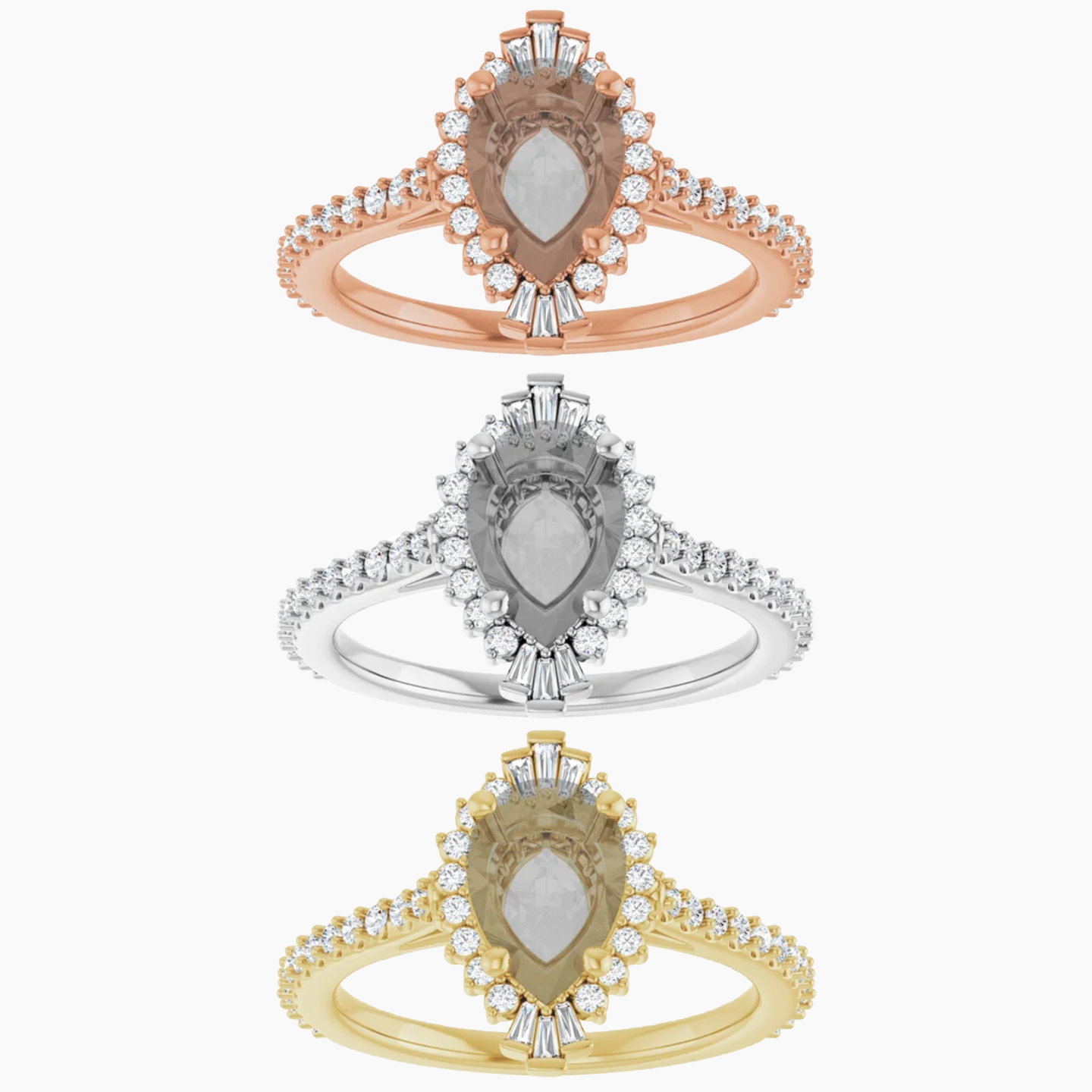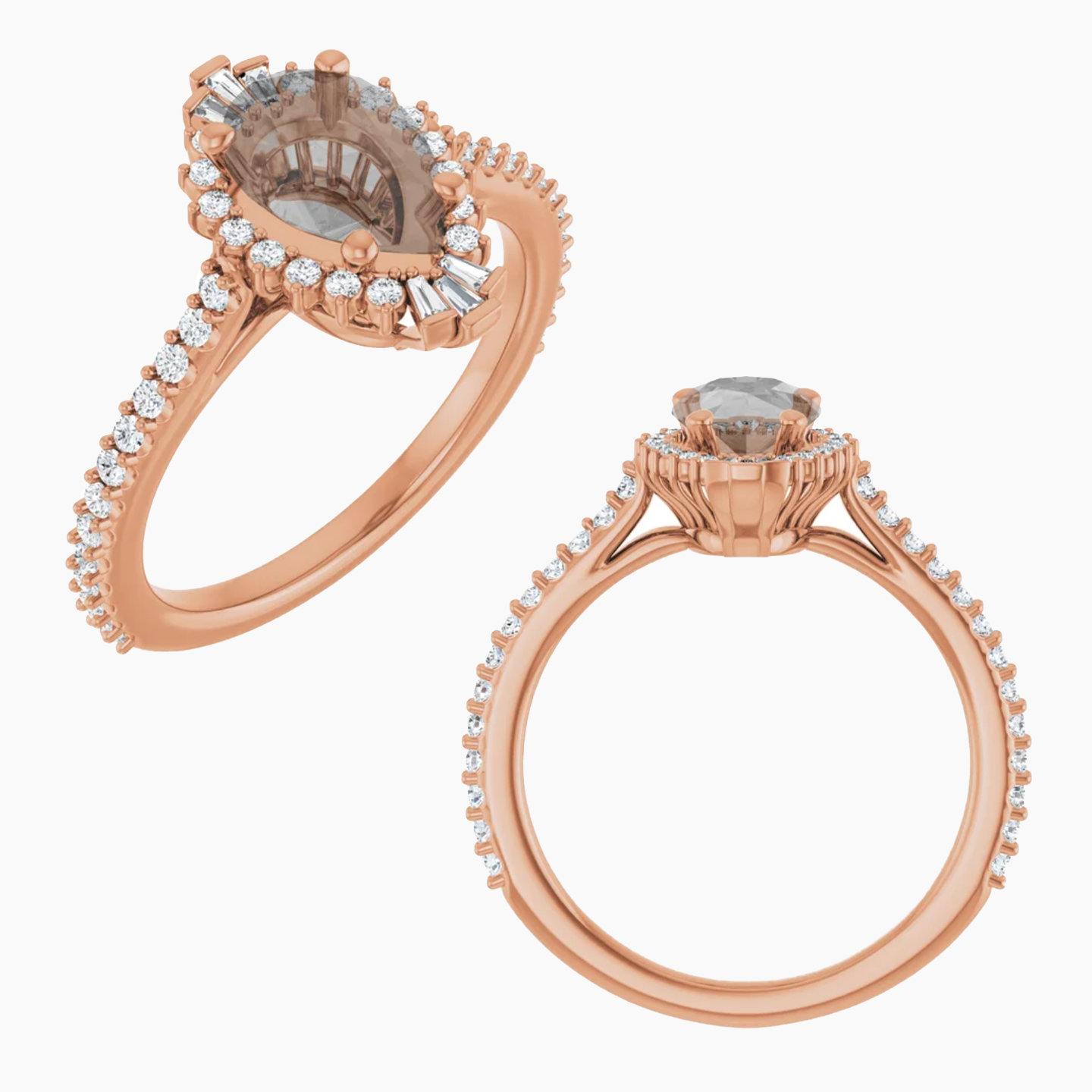 - This ornate setting has a mix of round and tapered baguette stones to perfectly show off the center stone.