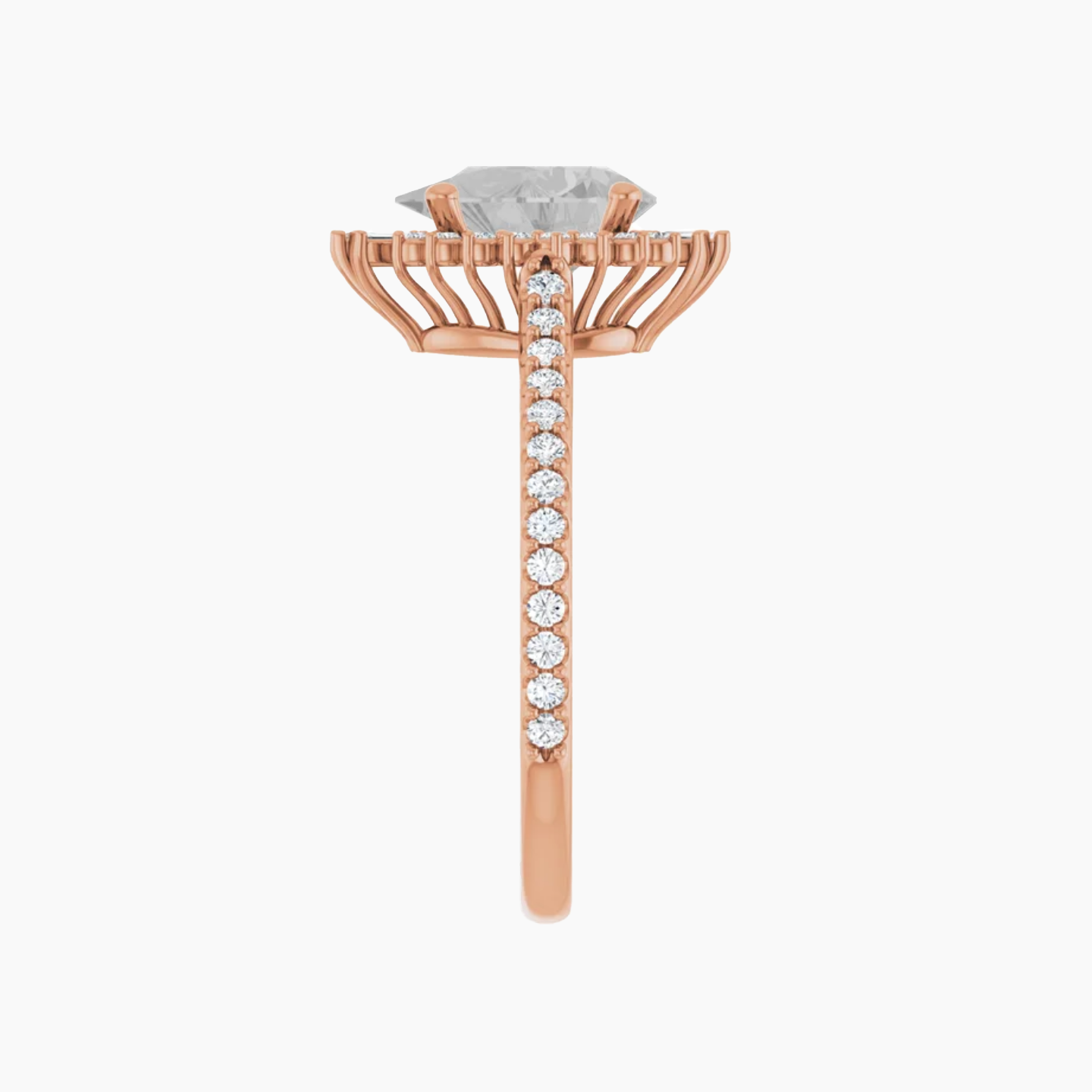 - Accent stones include 1.3mm round pave stones on the band, and the halo consists of 1.1mm round stones with a mix of 1.75mm x 1mm x .5mm and 2mm x 1mm x .5mm SI2-SI3 tapered baguette diamonds.