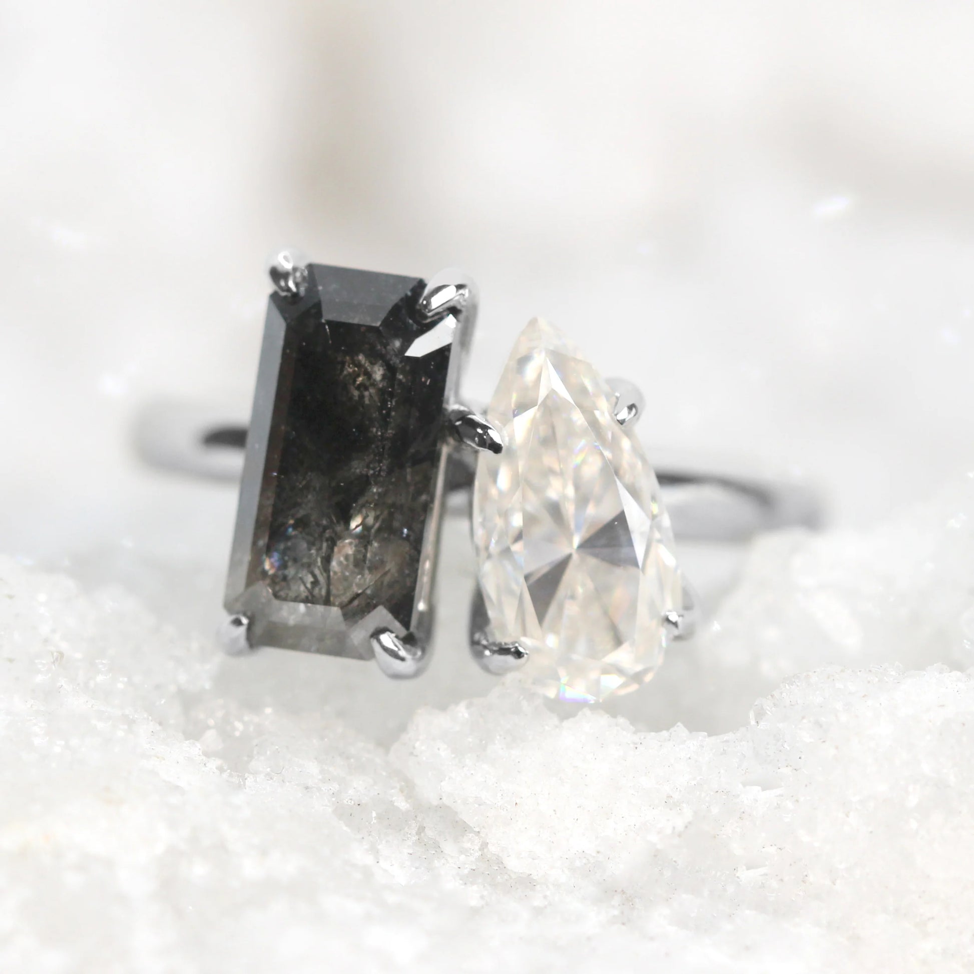 At Midwinter Co. Jewelry, we are a sustainable and tiny but trusted small business to create your unique and alternative bride type engagement rings. We are a leader in the salt and pepper diamond world, a quiet luxury brand that works one on one with you to design the most unique, gorgeous, modern jewelry. Midwinter Co. is also one of the only brands that specializes in acutely unique gemstones such as bi-color sapphires, teal green blue sapphires, mossy aquamarine, mossy agate, black tourmaline in quartz, gold in quartz, tourmaline in unique colors, gray sapphires, gray spinel, dark gray spinel, dark gray diamonds, black diamonds, black speckled diamonds, celestial diamonds, galaxy diamonds, dendritic agate, dendritic opal, dendritic quartz, branchy gemstones, quartz with black star hollandite, alexandrite, garnet, peridot with or without tourmaline, harmony quartz aka melody quartz aka seven stone quartz, morganite, emerald, topaz, misty white diamonds, white blue diamonds, opalescent diamonds, opalescent sapphires, parti sapphires, and more. Within our walls, we carry only a small select of stock as much of our work is custom. We custom design and personalize every ring setting/mounting to fit the unique gemstones and diamonds we carry. We can design you a custom ring set based off of a drawing or screen shots, aesthetics, themes, and more. We also have bridal necklaces, bridal earrings, mothers earrings, bridesmaids earrings, modern asymmetrical sapphire diamond earrings and more. Our small team is mighty and caring. Midwinter Co. is top rated with 5/5 100% 5 star on google. Drive 25-35 minutes from Philadelphia to visit our showroom to see our in stock pieces and stones. We can create: couples rings, rings for couples, rings for twins, twins rings, ring sets for couples, matching ring sets, custom stacking rings, custom stacking ring sets, bridal sets, custom right hand rings, custom mother gemstone rings, vintage style rings, modern style engagement rings, rings for the alt-bride, etc. We are LGBTQIA+ friendly, husband and wife owned. Our brand has been featured on E! News, Refinery 29, Vogue UK & magazines nation and internationally. We hope to be a small part of your story. Thank you for being a big part of ours!