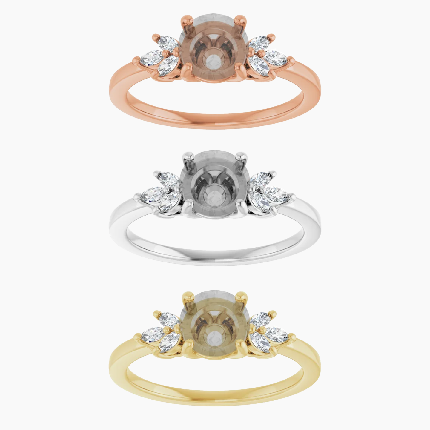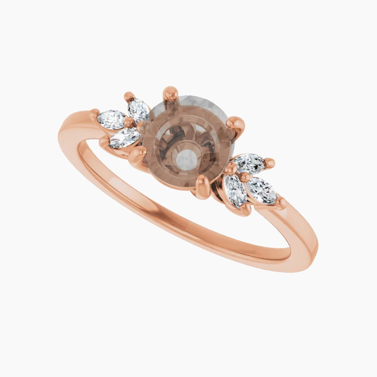 - A cluster of marquise diamonds on either side of the center stone form a subtle, nature inspired design.