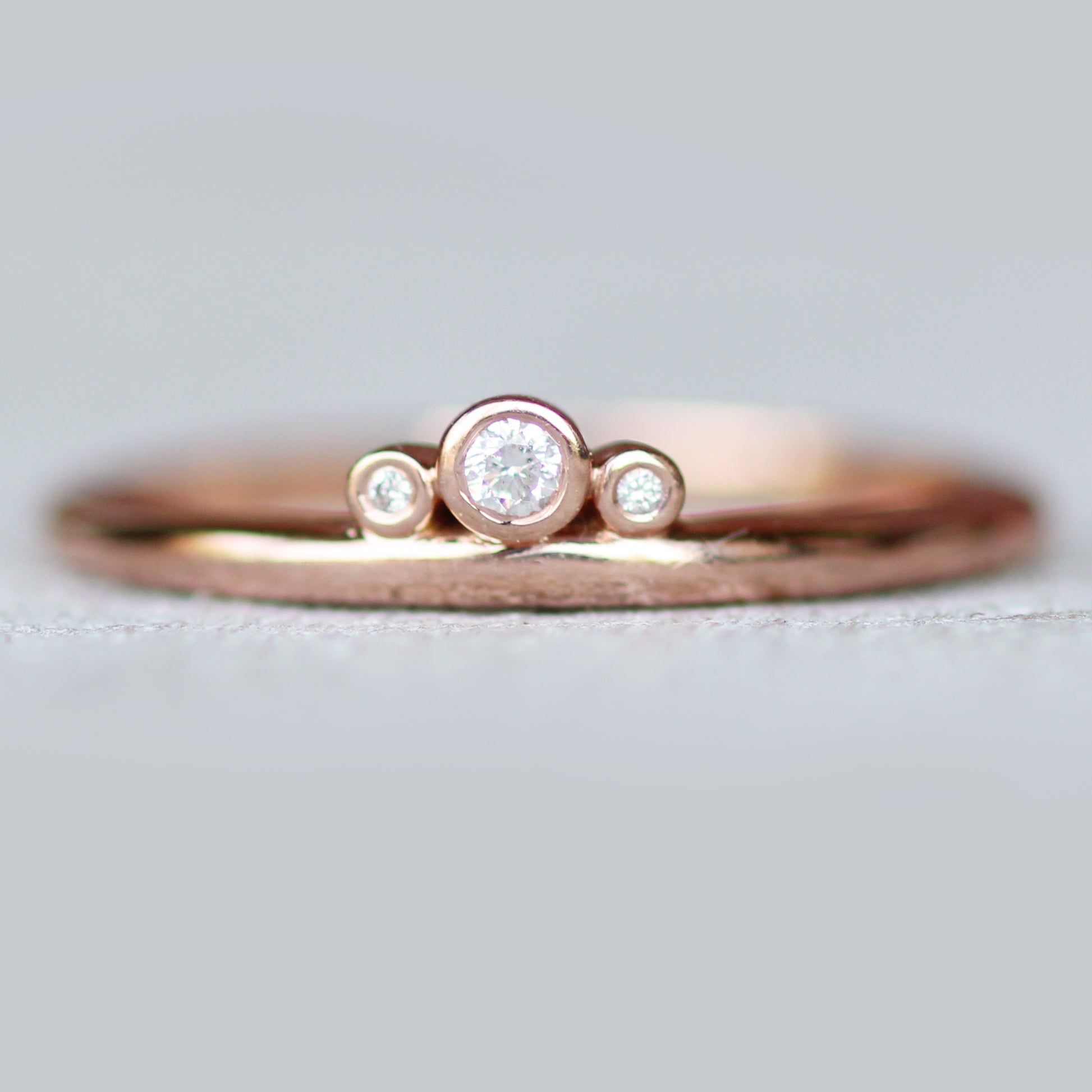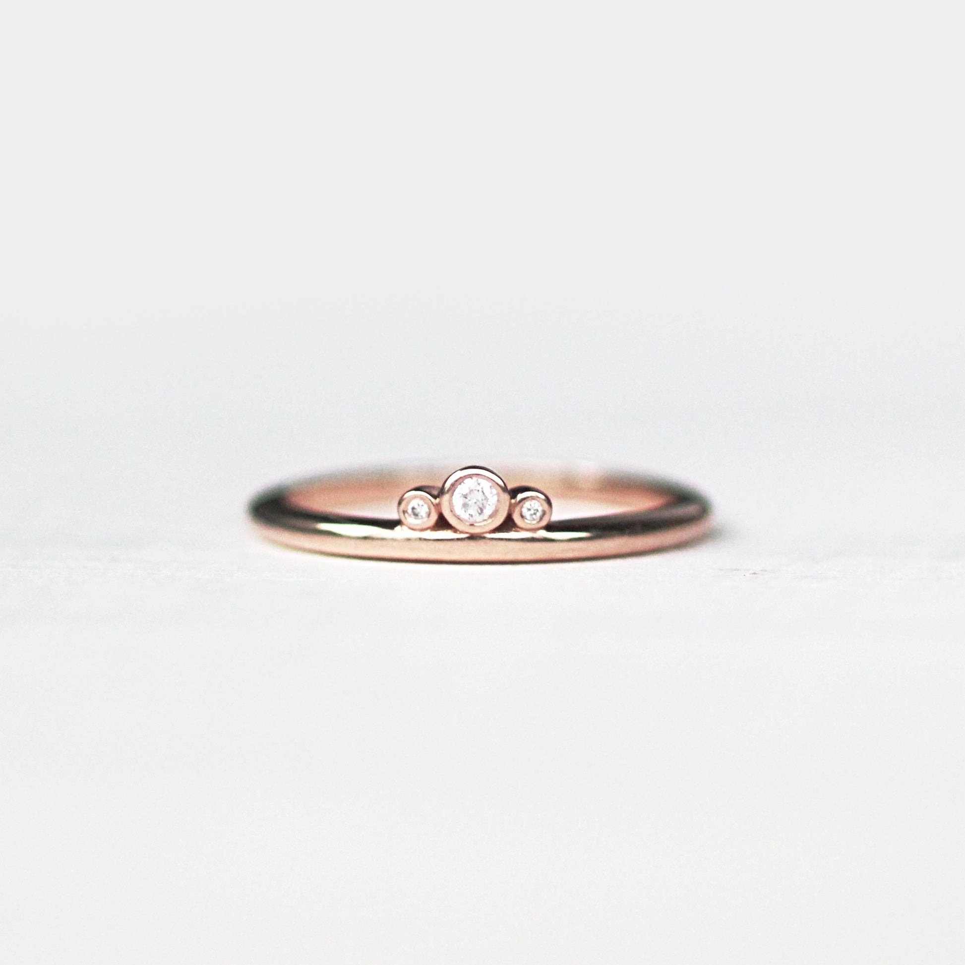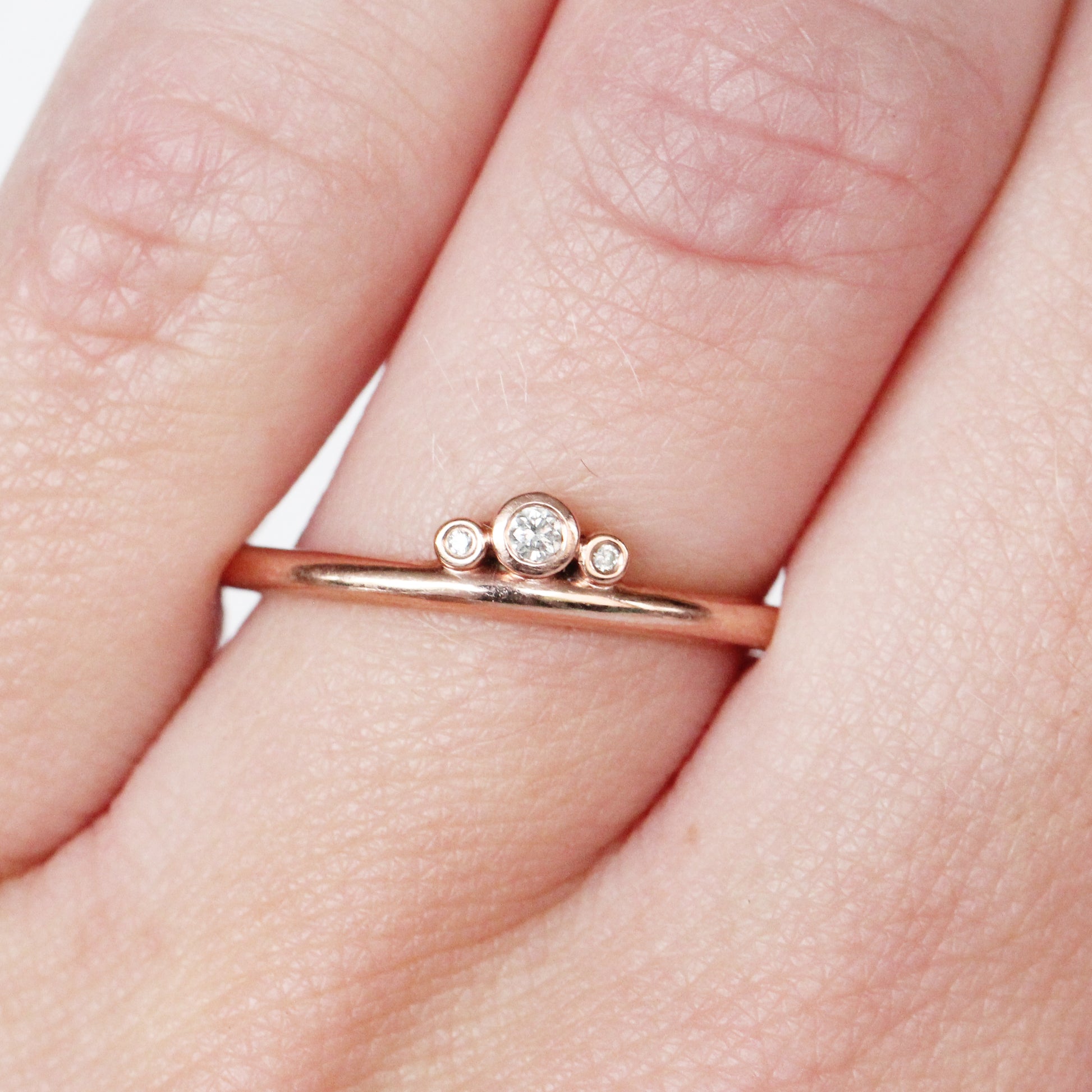 • This simple, bezel set three stone band is the perfect lightweight, low-set piece for everyday wear or wearing in a stack!