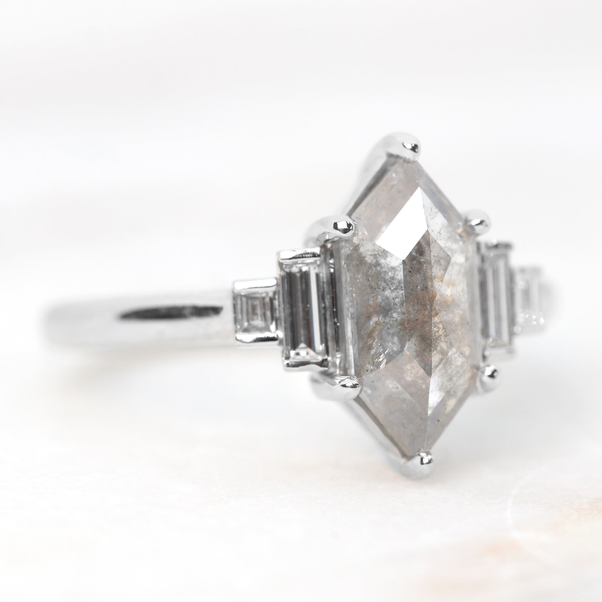 - Accent stones: One 4mm and one 2.5mm white baguette diamond sit on each side of the center stone