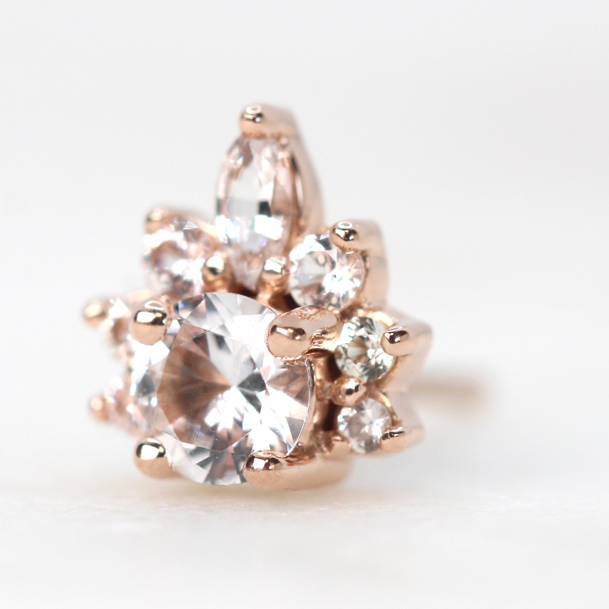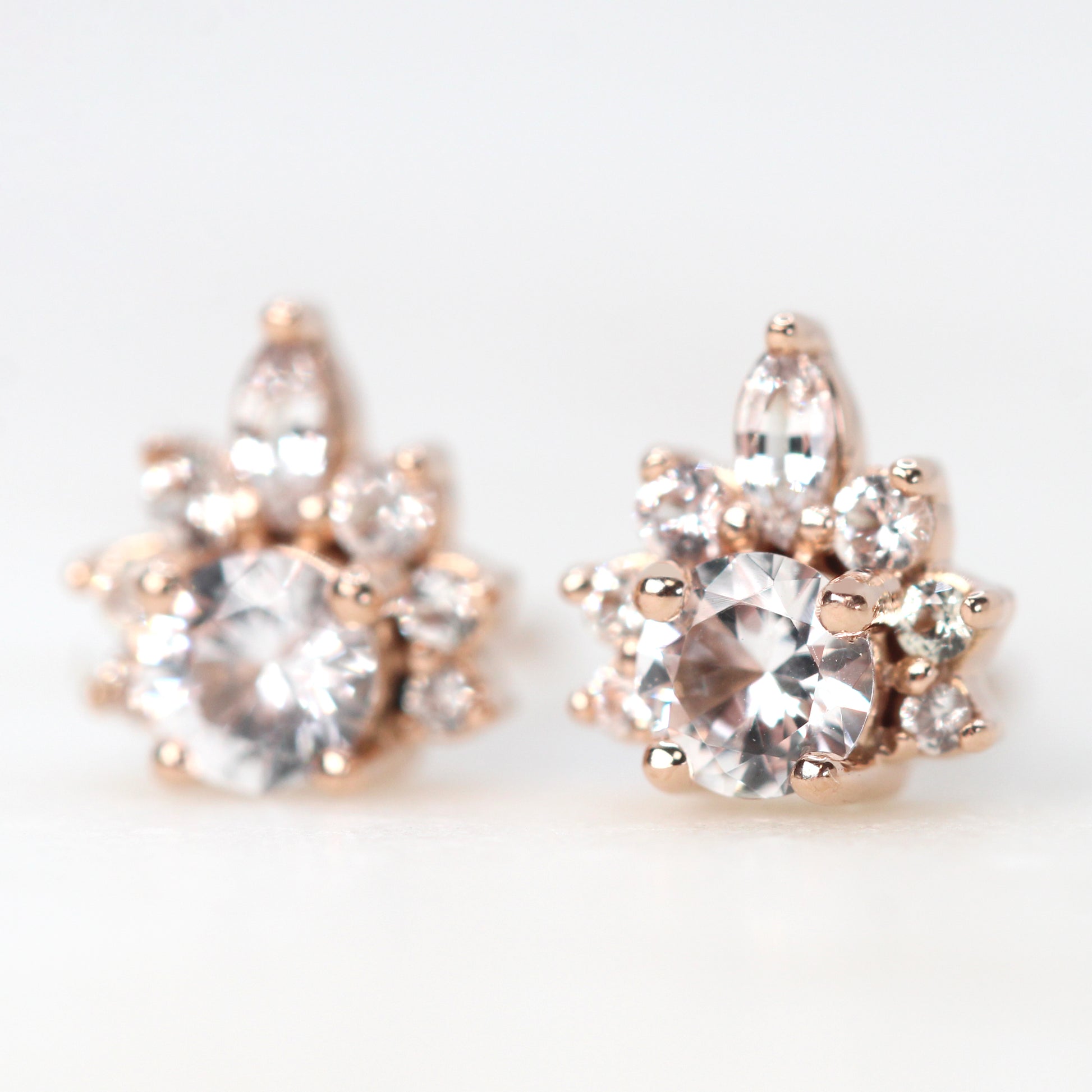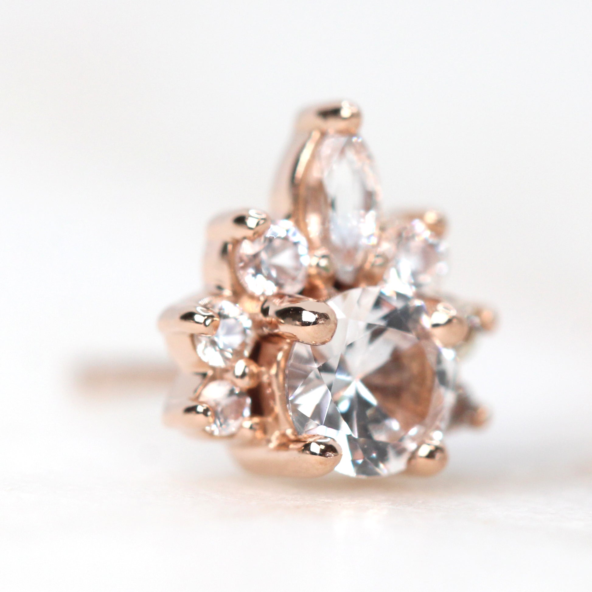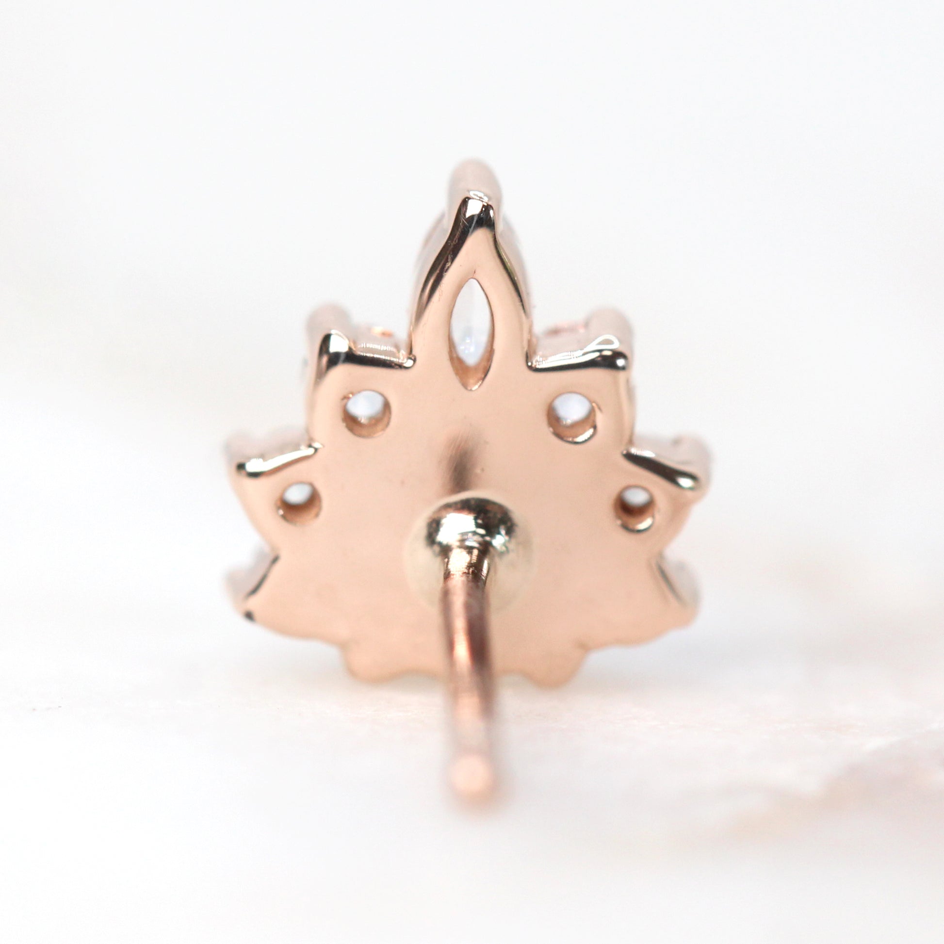 These earrings feature round and marquise white sapphires set in 14k gold, in a design that is reminiscent of a sunburst!